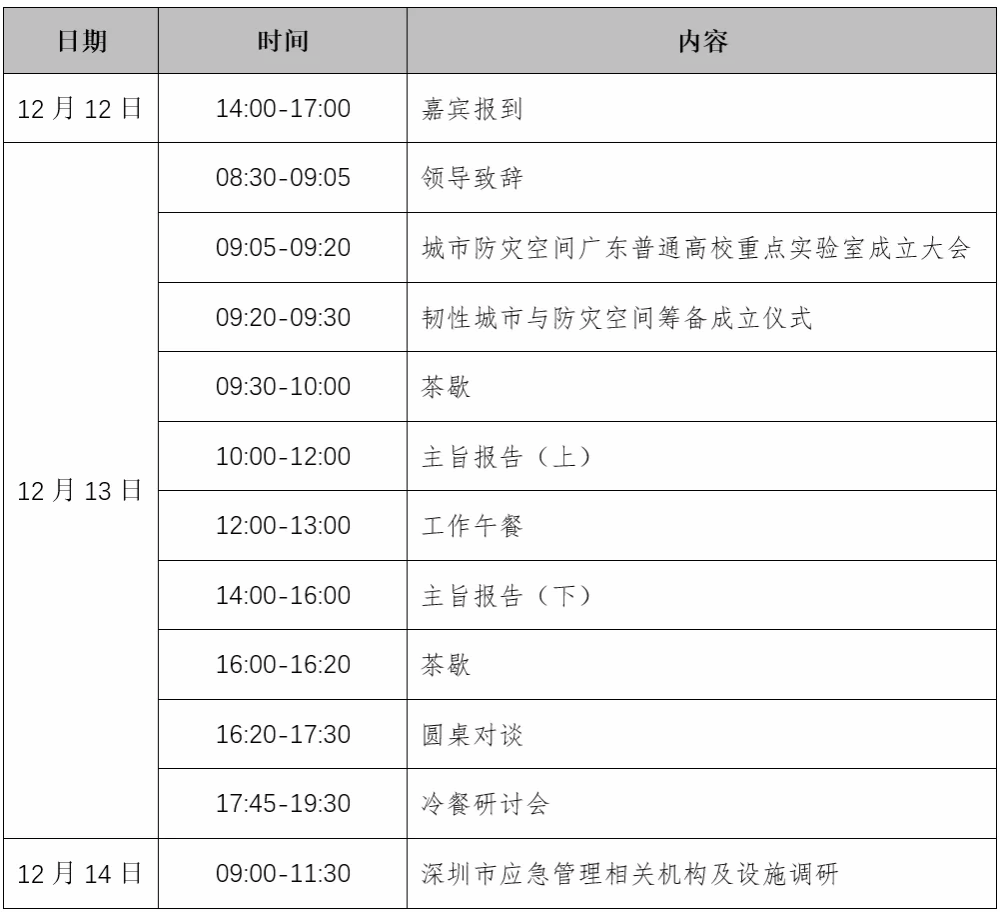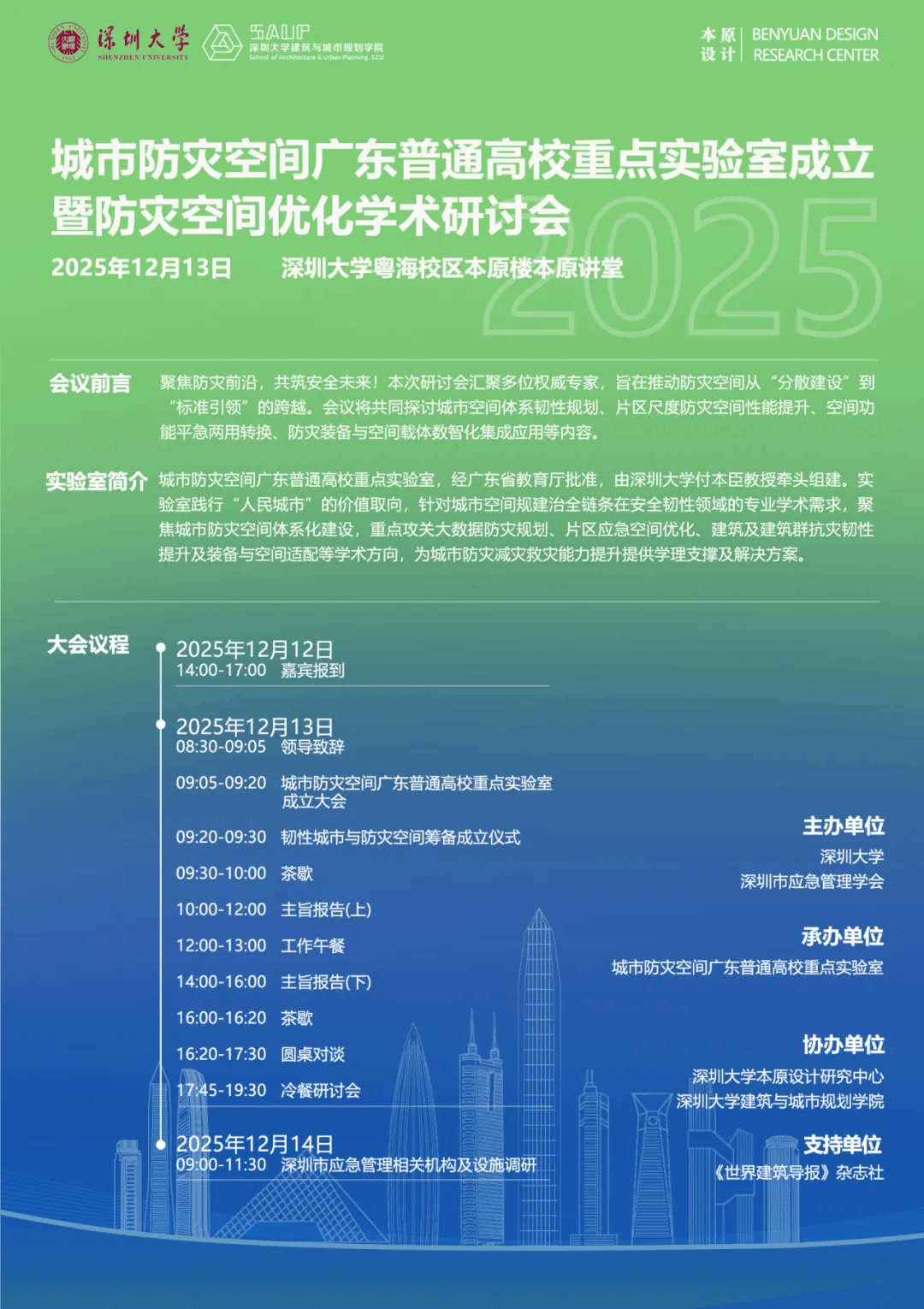 直面防灾空间碎片化、设防标准不统一、应急响应低效率等现实痛点,我们选择聚焦防灾空间优化学术方向,拟定于2025年12月12日-14日在深圳大学举办城市防灾空间广东普通高校重点实验室成立暨防灾空间优化学术研讨会,共同探讨城市空间体系韧性规划、片区尺度防灾空间性能提升、空间功能平急两用转换、防灾装备与空间载体数智化集成应用等内容。