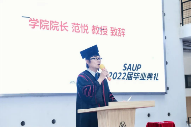 首先是范悦为毕业生致辞。他祝贺2022届毕业生们,在经历学习生涯中“云课堂”、“云讲座”、“云答辩”后,成功应对疫情带来的各种不确定性与挑战,依然圆满完成学业。大家是学院快速发展的亲历者和见证者,未来也会成为城市与建筑文化的传播者与守护者。他希望同学们牢记校训,脚踏实地“做好自己”,“独立思考、不断学习”;“保持热爱、不忘初心”;努力打磨自己,“10年、20年后,回来还是那个闪光少年!”