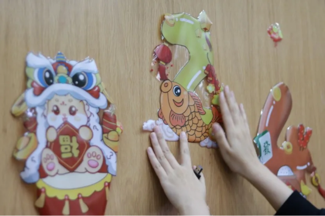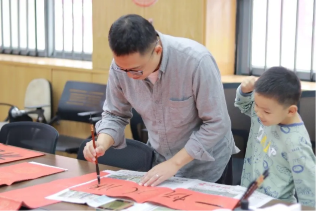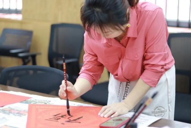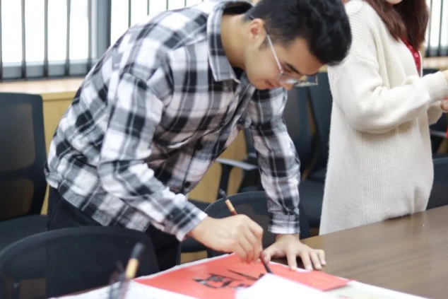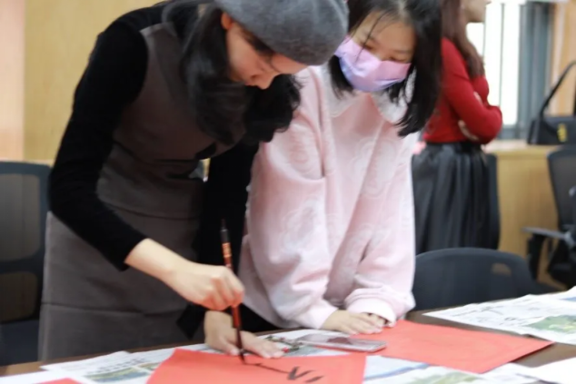 茶话会过程中,大家开启了自己的“创作”——写春联,书写过程还不忘提醒自己书写对称,注意构图(专业知识牢记于心)。
